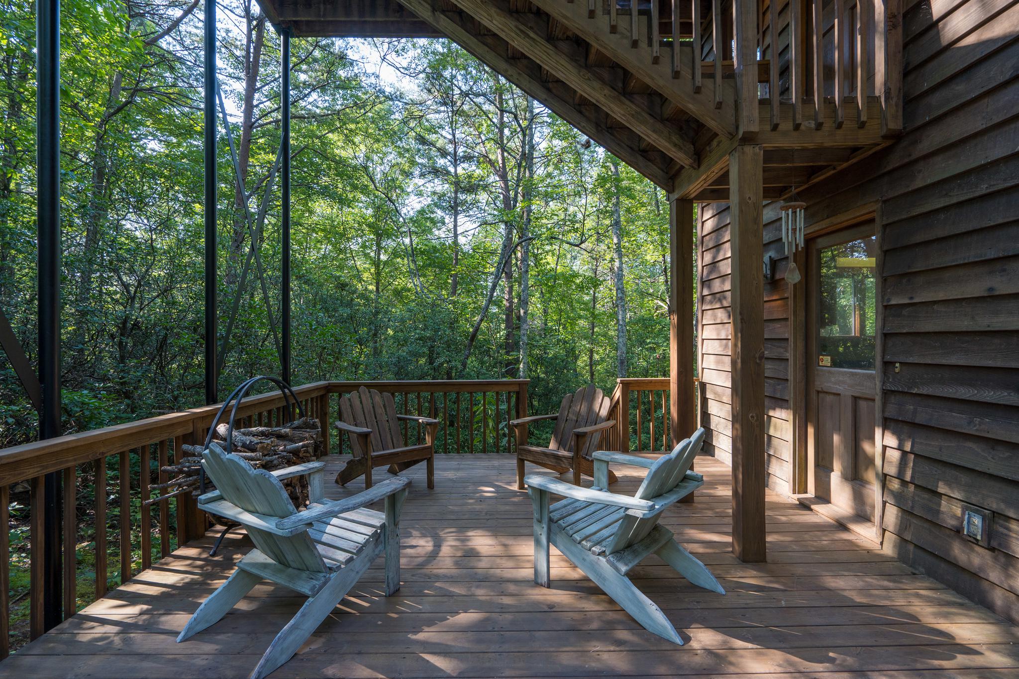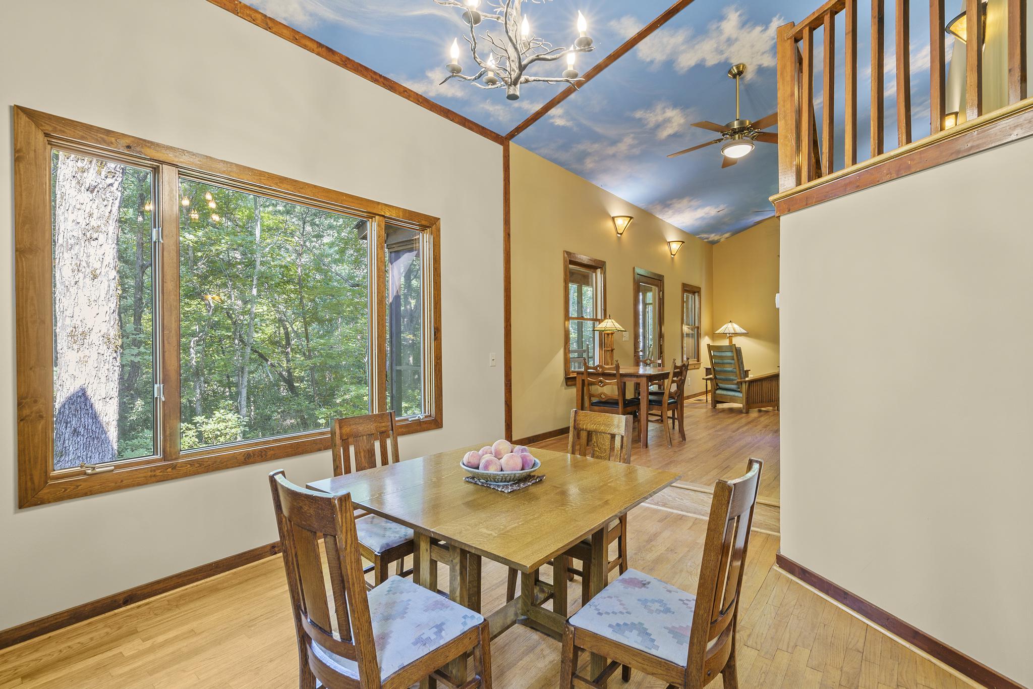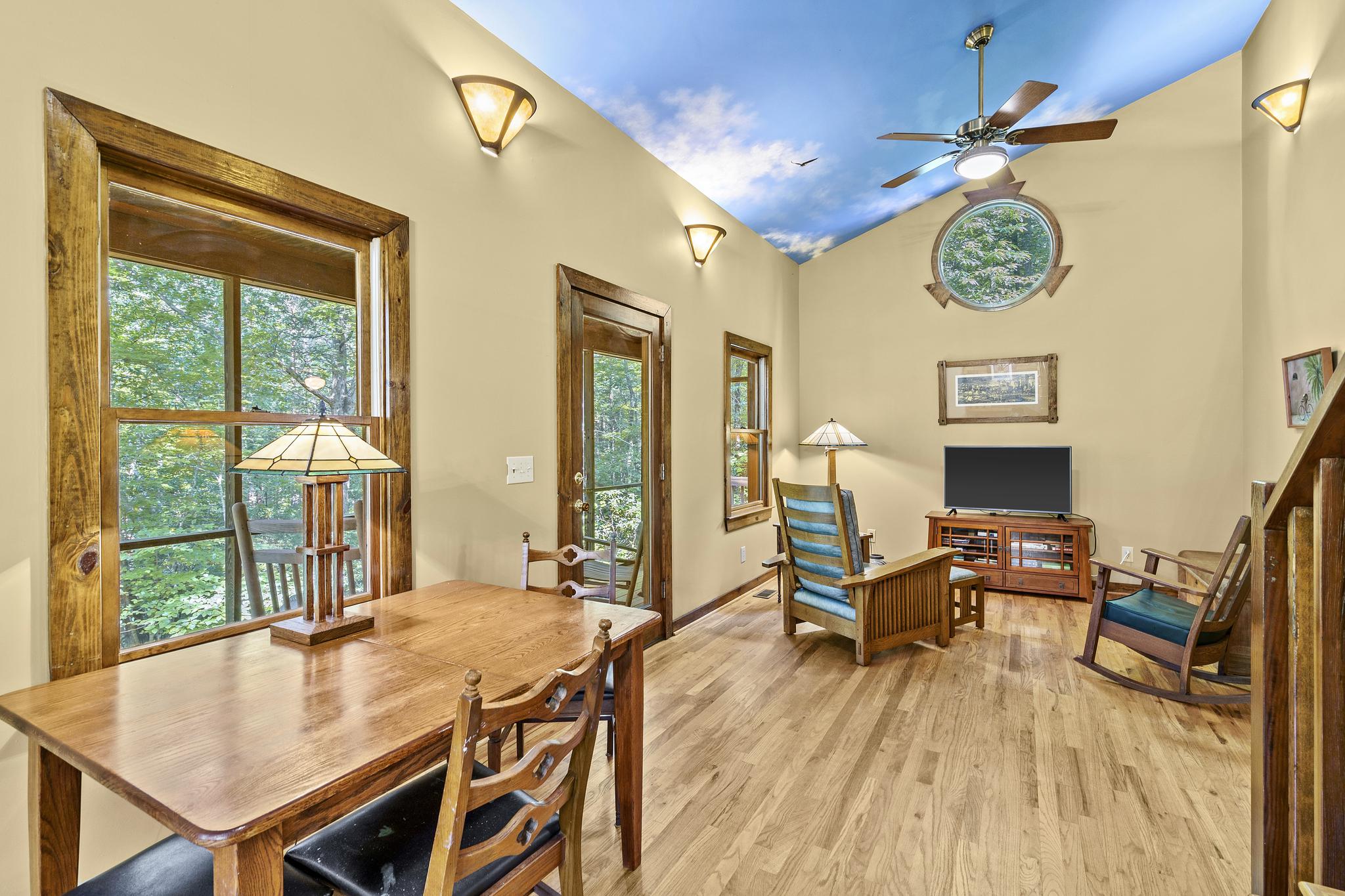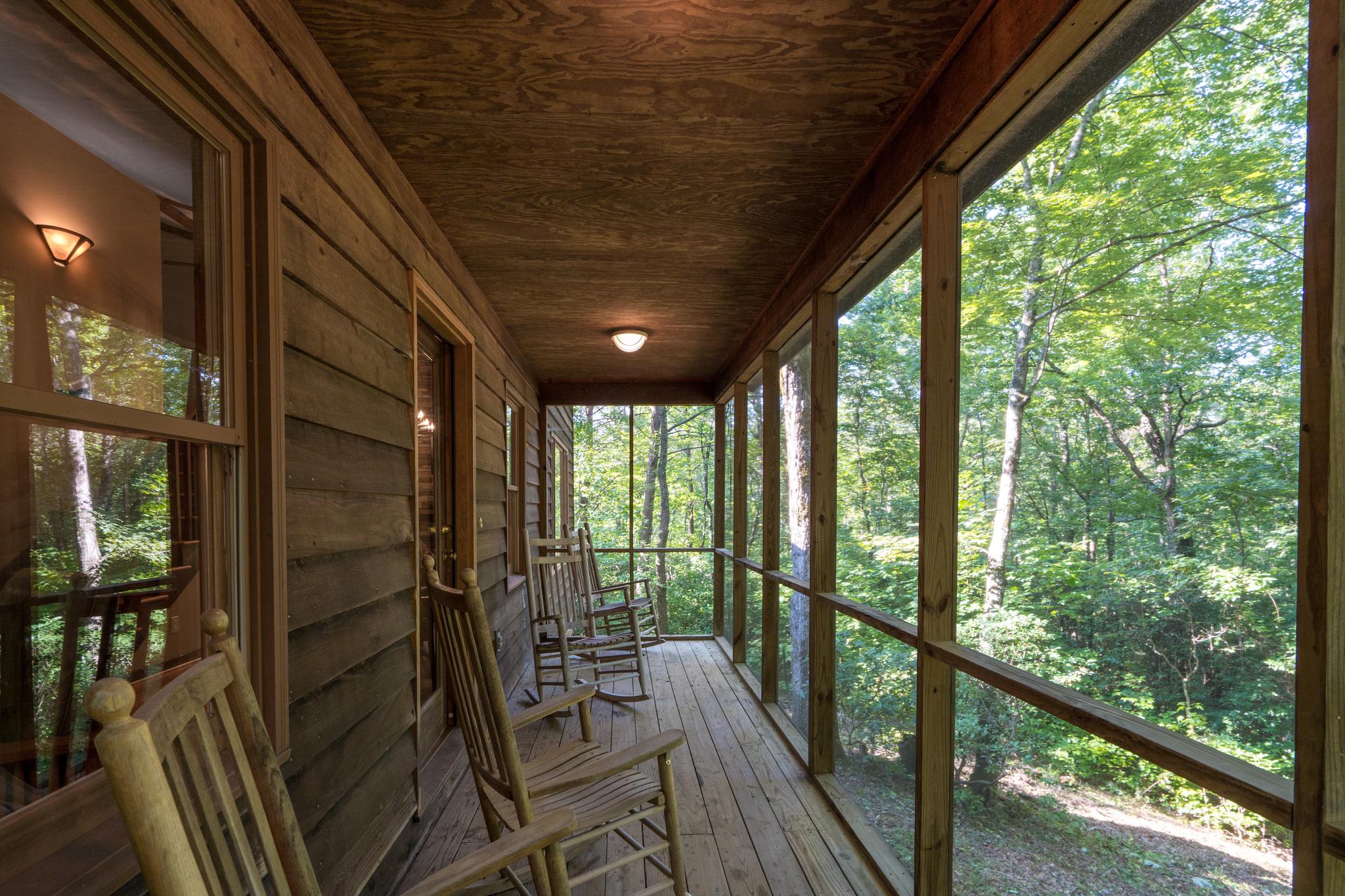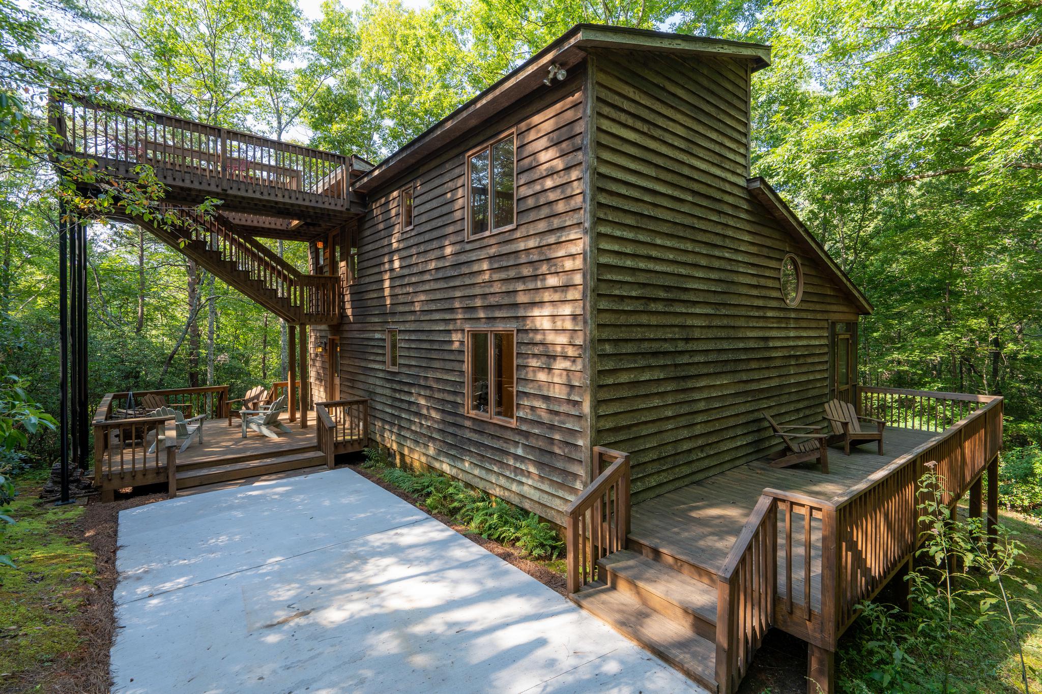 This home has a fully equipped kitchen, a stone wood burning fireplace to warm cool nights, a screened porch for watching wildlife and rare Blue Ghost fireflies, and even a covered deck, for summer gatherings. Great for intimate evenings dining alfresco. Comfortable rustic details define this two-level, unassuming cottage hidden deep in the woods off of a rugged, partially paved private drive. The main level of the cottage boasts; soaring ceilings with an original Kerry Parkman ceiling mural above the living/family room and the dining area with fireplace, a full kitchen with pantry and stackable laundry, and the master bedroom with en-suite; including a jetted tub/shower and walk-in closet. Upstairs is a 2nd bedroom, full bath, loft and access to the rooftop deck.