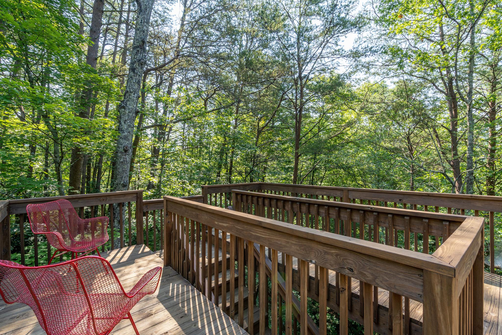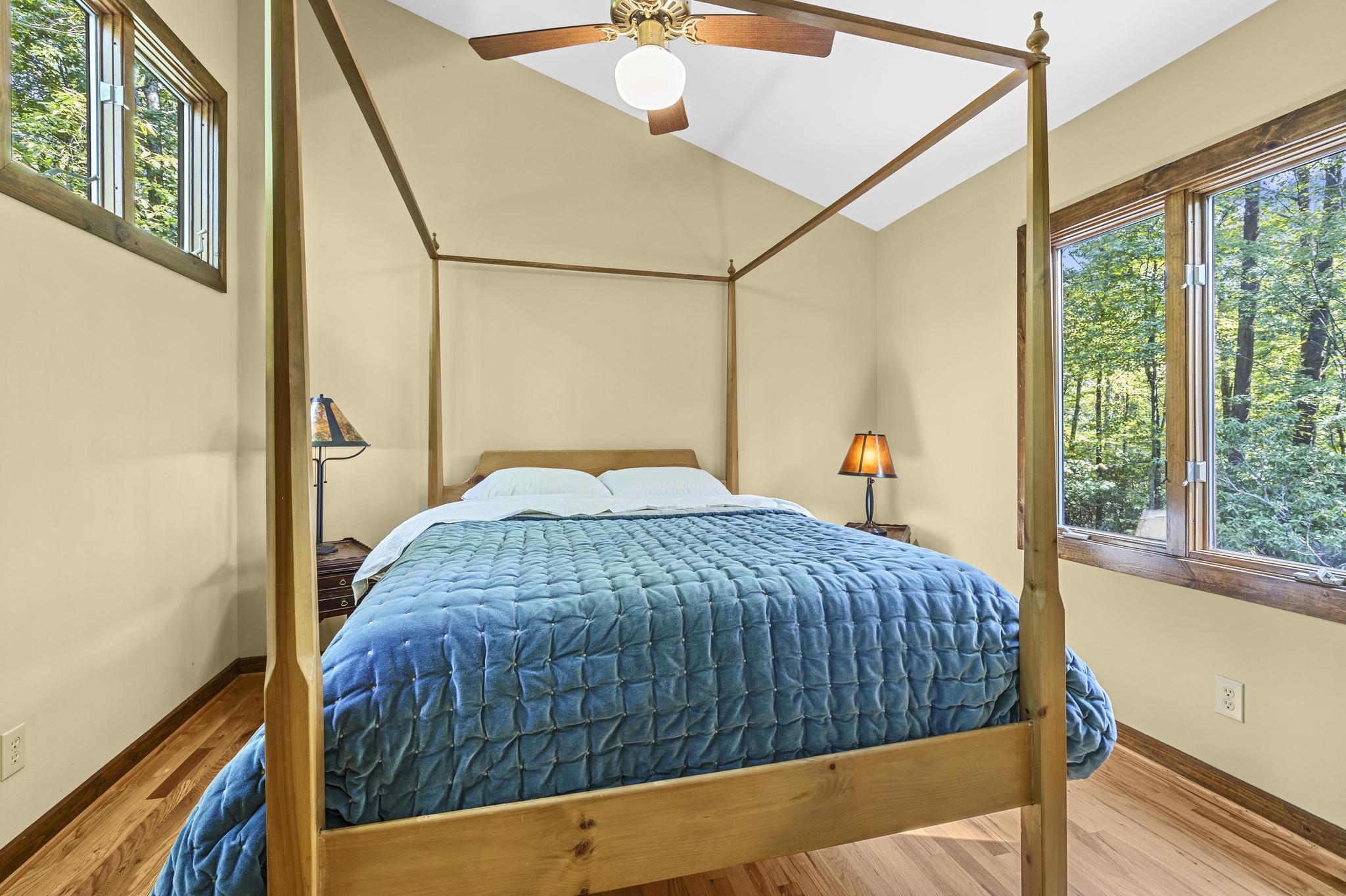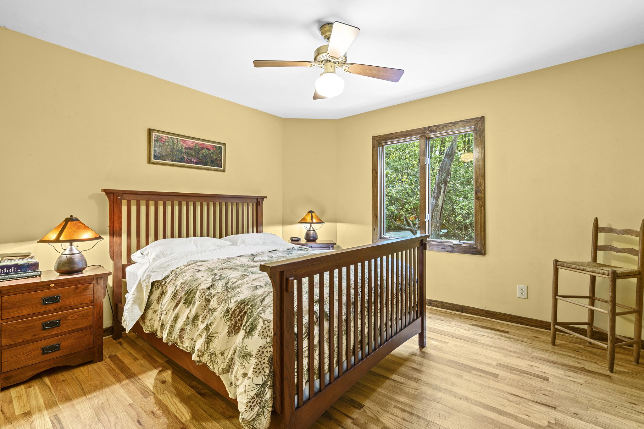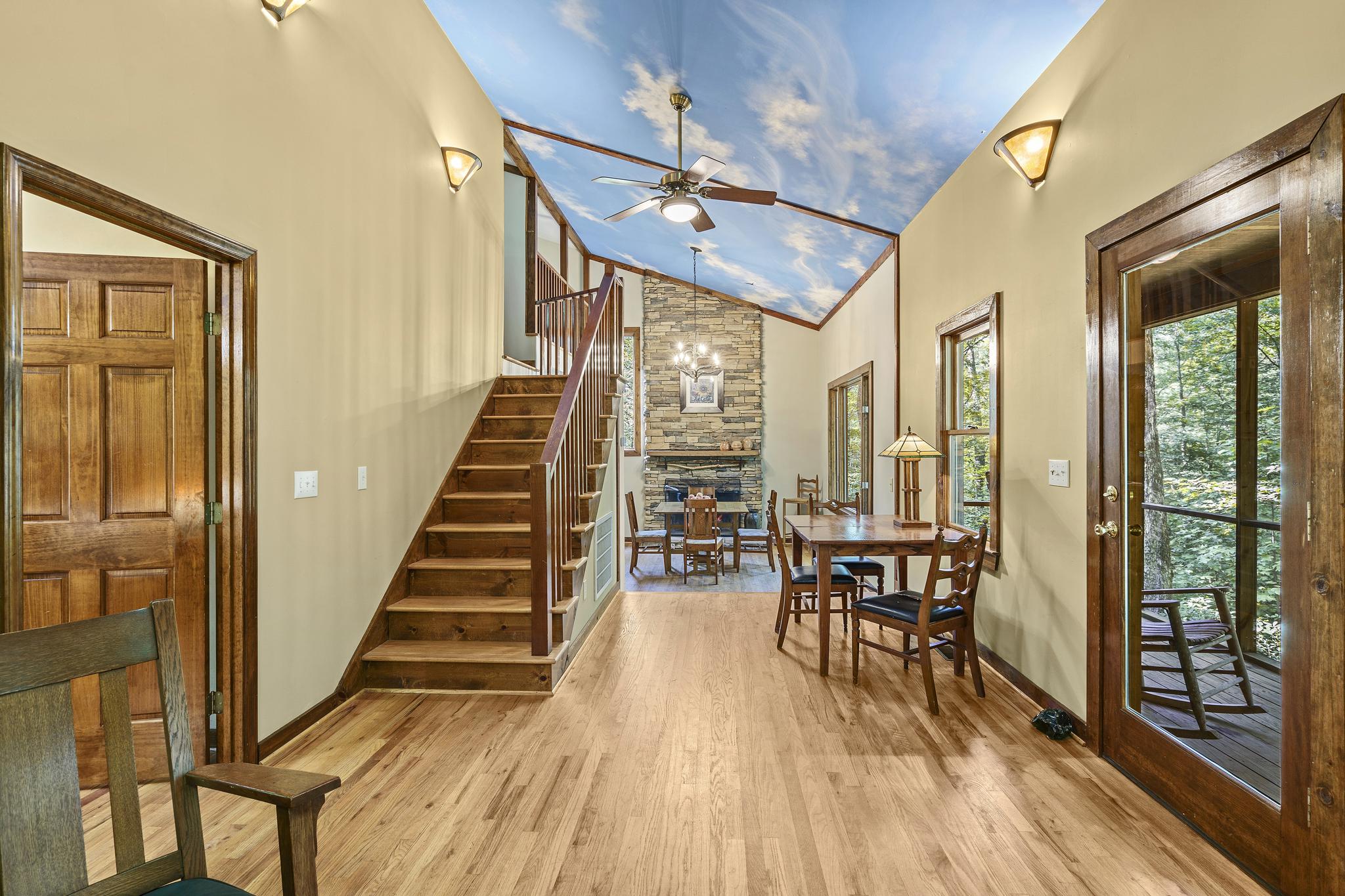 This home has a fully equipped kitchen, a stone wood burning fireplace to warm cool nights, a screened porch for watching wildlife and rare Blue Ghost fireflies, and even a covered deck, for summer gatherings. Great for intimate evenings dining alfresco. Comfortable rustic details define this two-level, unassuming cottage hidden deep in the woods off of a rugged, partially paved private drive. The main level of the cottage boasts; soaring ceilings with an original Kerry Parkman ceiling mural above the living/family room and the dining area with fireplace, a full kitchen with pantry and stackable laundry, and the master bedroom with en-suite; including a jetted tub/shower and walk-in closet. Upstairs is a 2nd bedroom, full bath, loft and access to the rooftop deck.