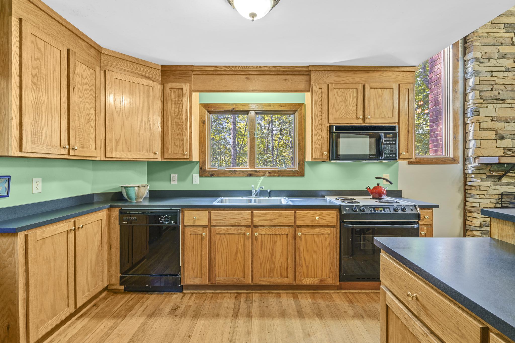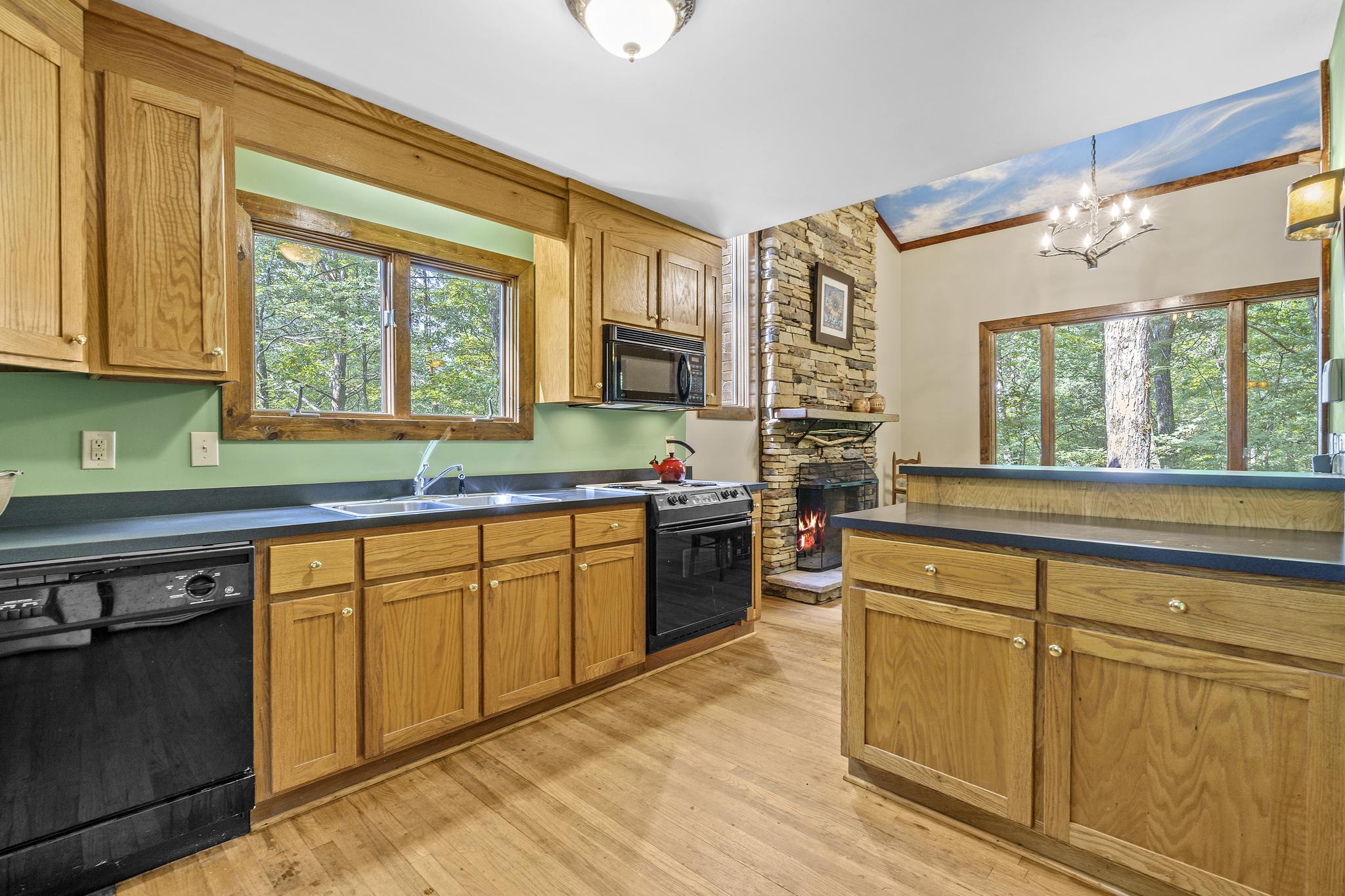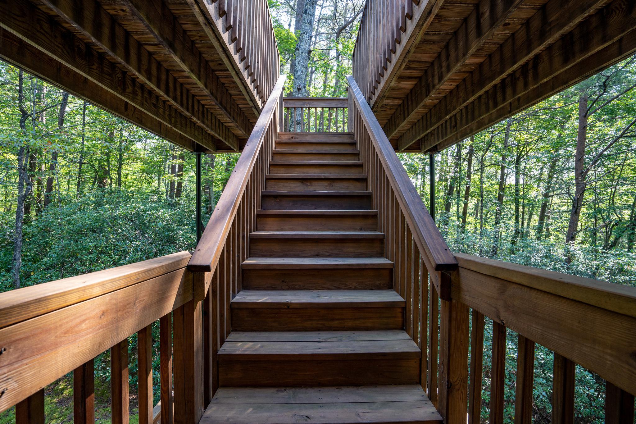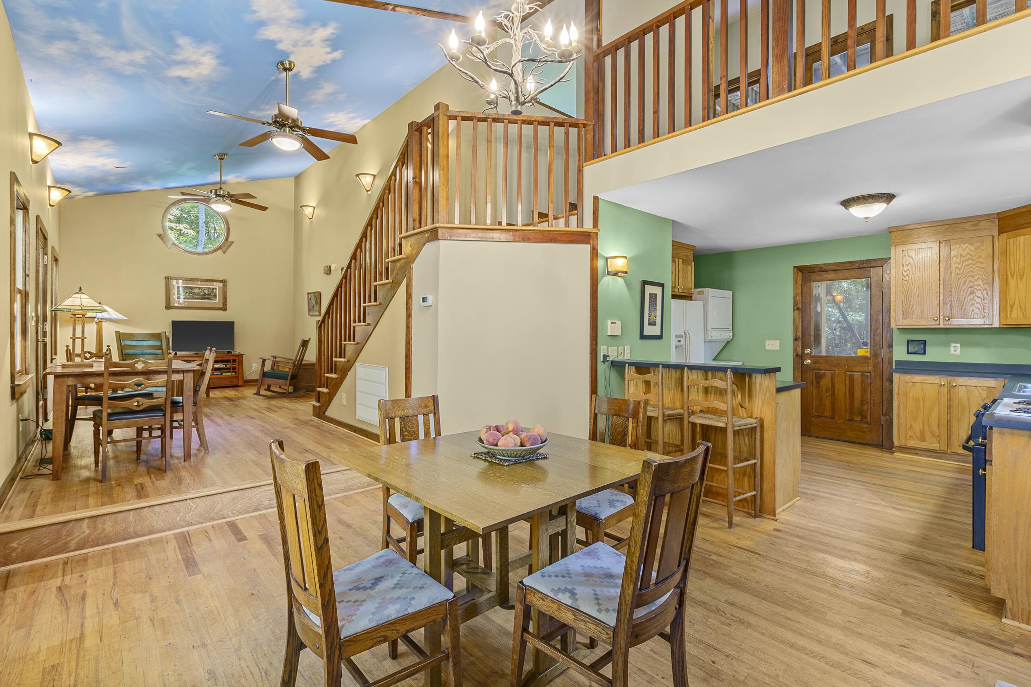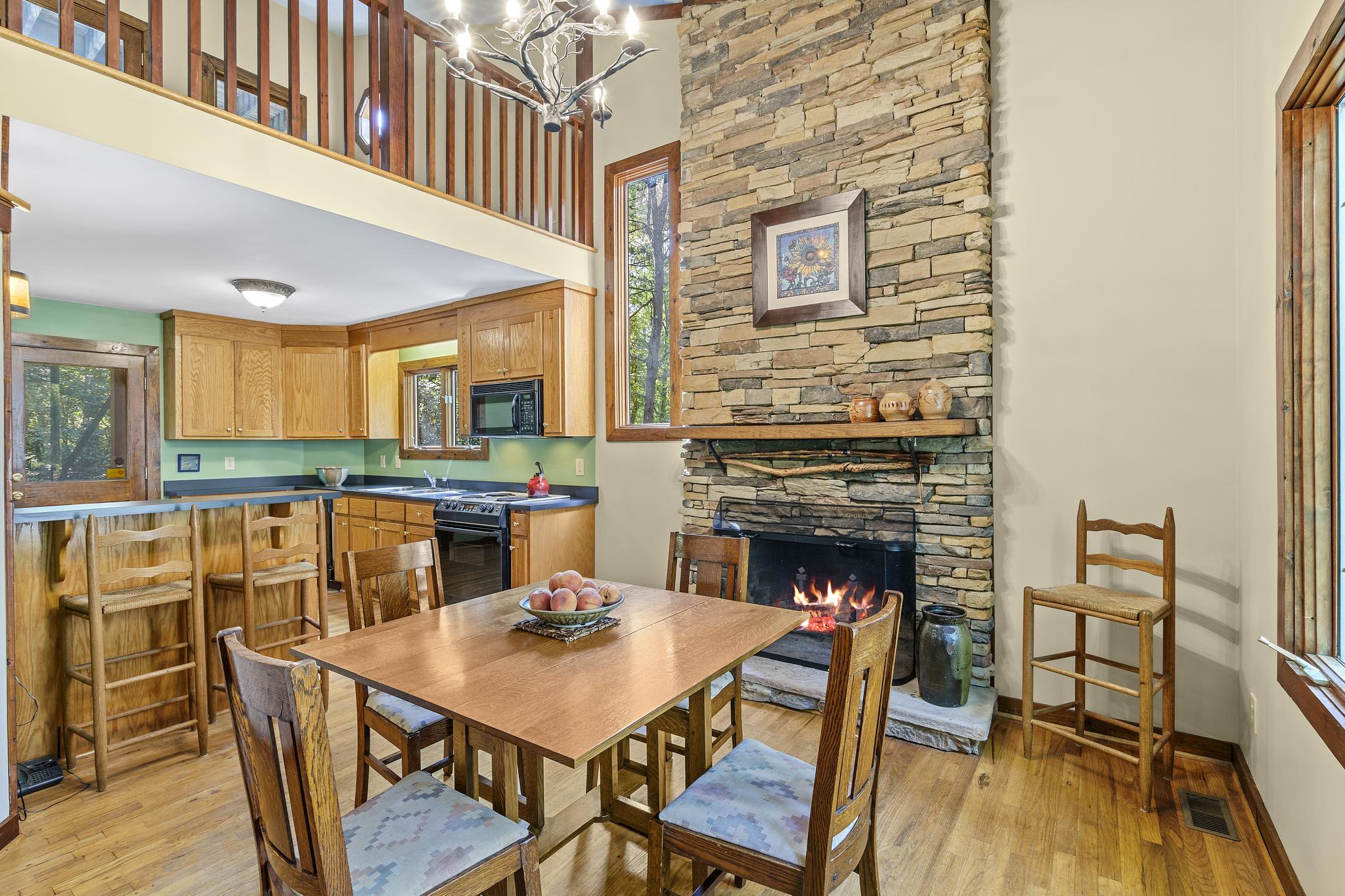 This home has a fully equipped kitchen, a stone wood burning fireplace to warm cool nights, a screened porch for watching wildlife and rare Blue Ghost fireflies, and even a covered deck, for summer gatherings. Great for intimate evenings dining alfresco. Comfortable rustic details define this two-level, unassuming cottage hidden deep in the woods off of a rugged, partially paved private drive. The main level of the cottage boasts; soaring ceilings with an original Kerry Parkman ceiling mural above the living/family room and the dining area with fireplace, a full kitchen with pantry and stackable laundry, and the master bedroom with en-suite; including a jetted tub/shower and walk-in closet. Upstairs is a 2nd bedroom, full bath, loft and access to the rooftop deck.